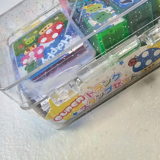 Contains: 12 stamps, 1 mini stamp pad, 1 mini notepad & 1 plastic storage case